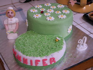Un double gâteau pour une infirmière fêtant son anniversaire sur le thème de la campagne.