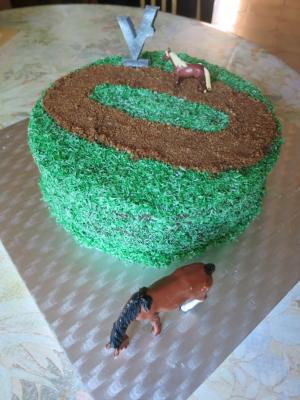 Pour un cavalier, un gâteau hippodrome avec le poteau d’arrivée de Vincennes.